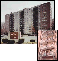 Essex House is a 135-unit high-rise apartment building consisting of 67 one bedroom, 45 two bedroom, and 23 three bedroom units. Amenities include large apartments, all utilities, wall-to-wall carpeting, a camera security system, laundry room, children's playground, a pool, parking, and two community rooms with kitchen facilities.